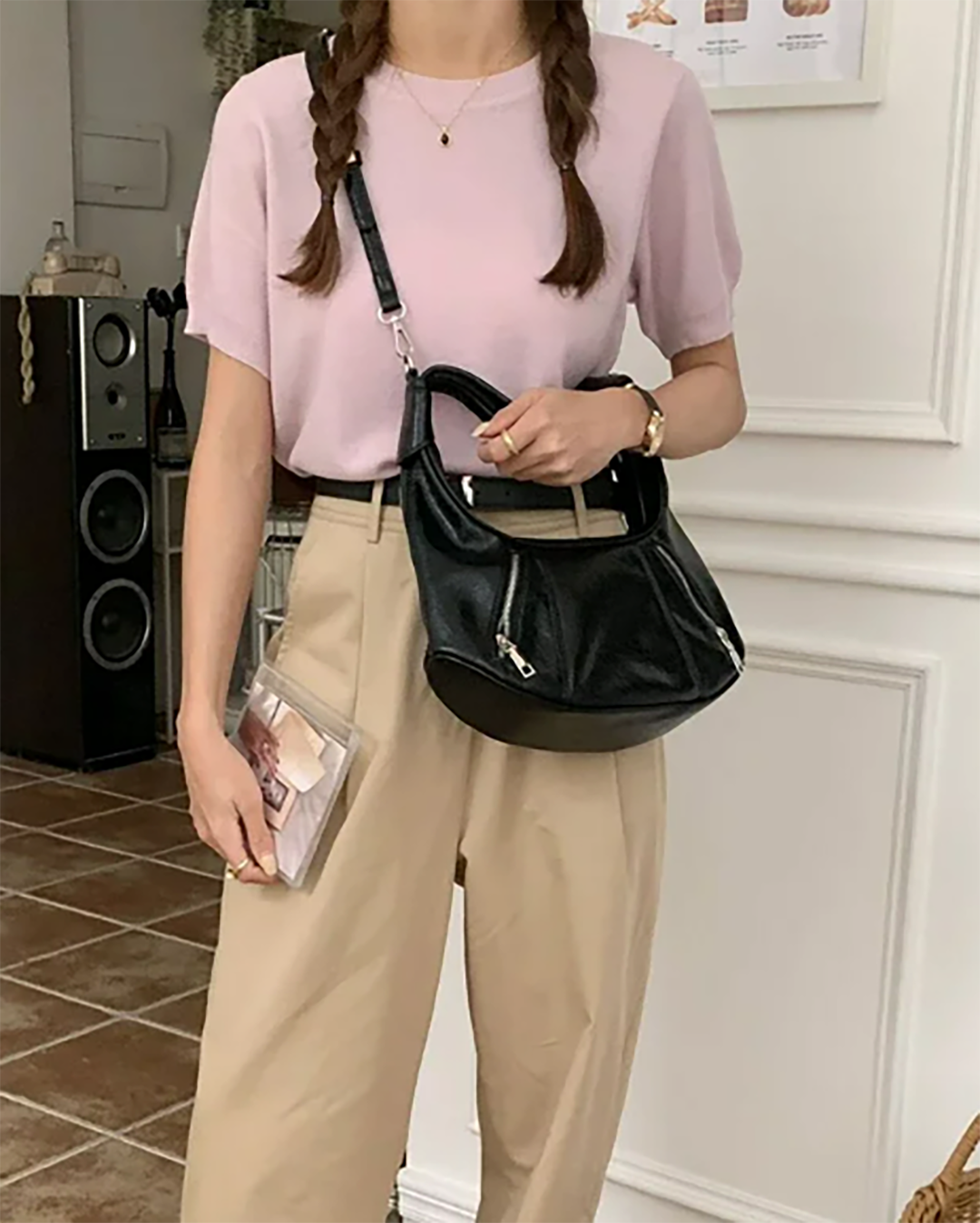 Black leather cross body bag with silver zippers