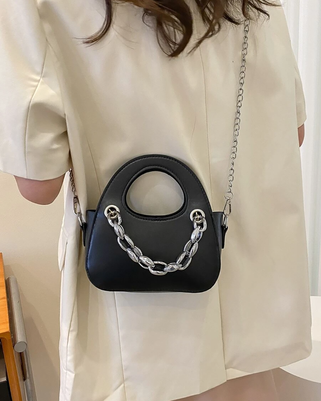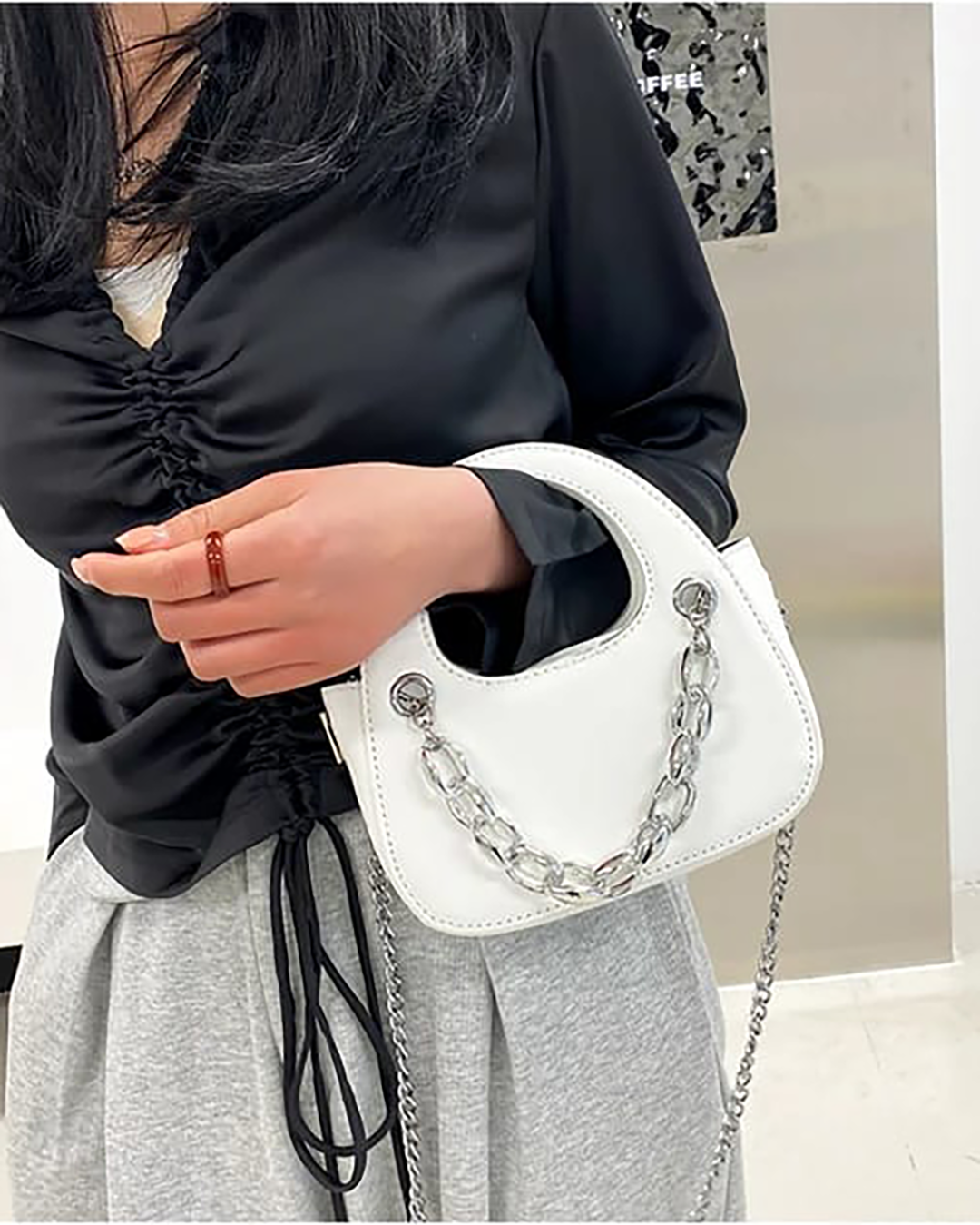 Patent leather cross and hand bag with a silver sling chain , comes in different colors