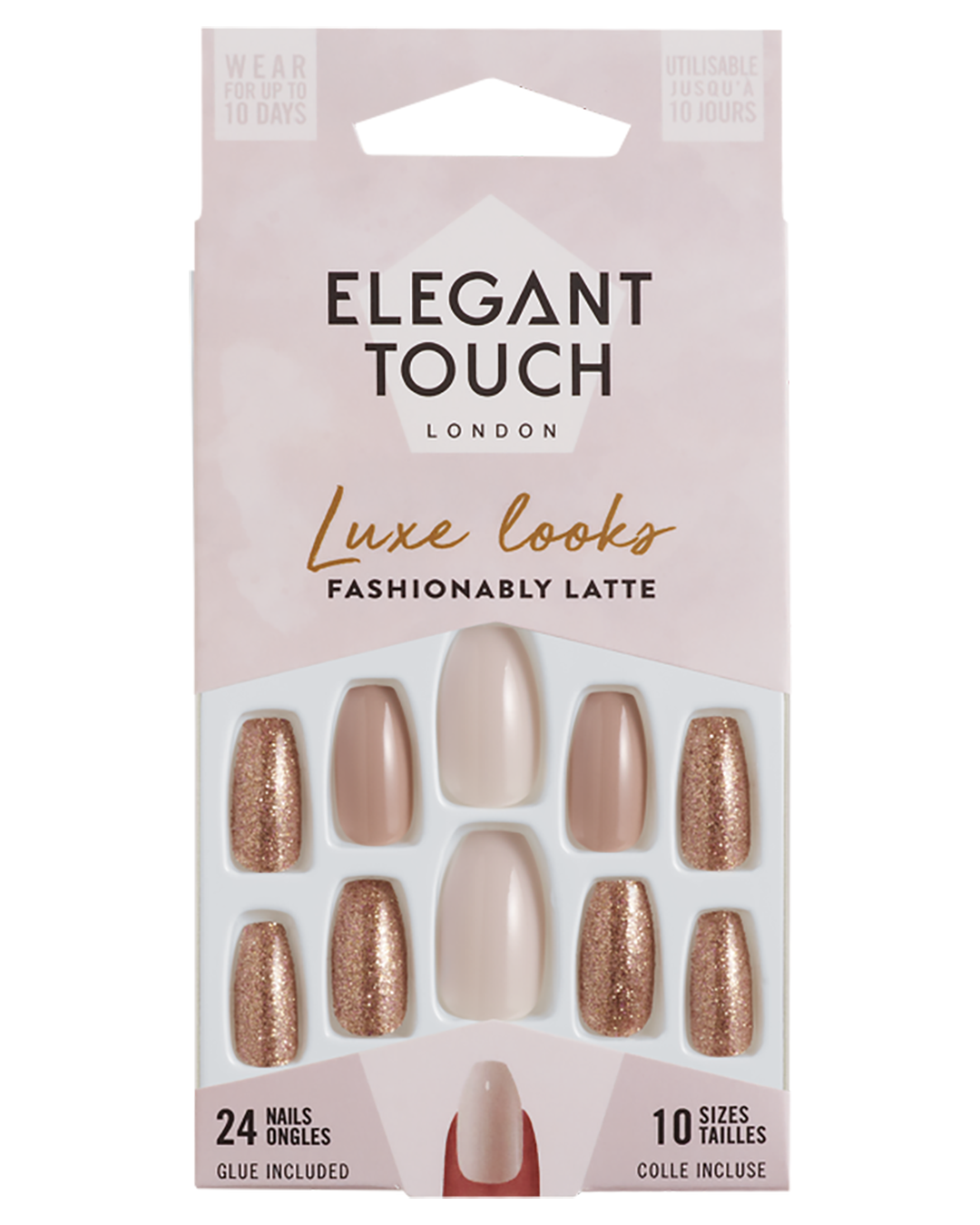 Fashionably Latte is made up of a creamy coffee shade, and a neutral taupe shade with rose gold glitter accents nails to top off the look.