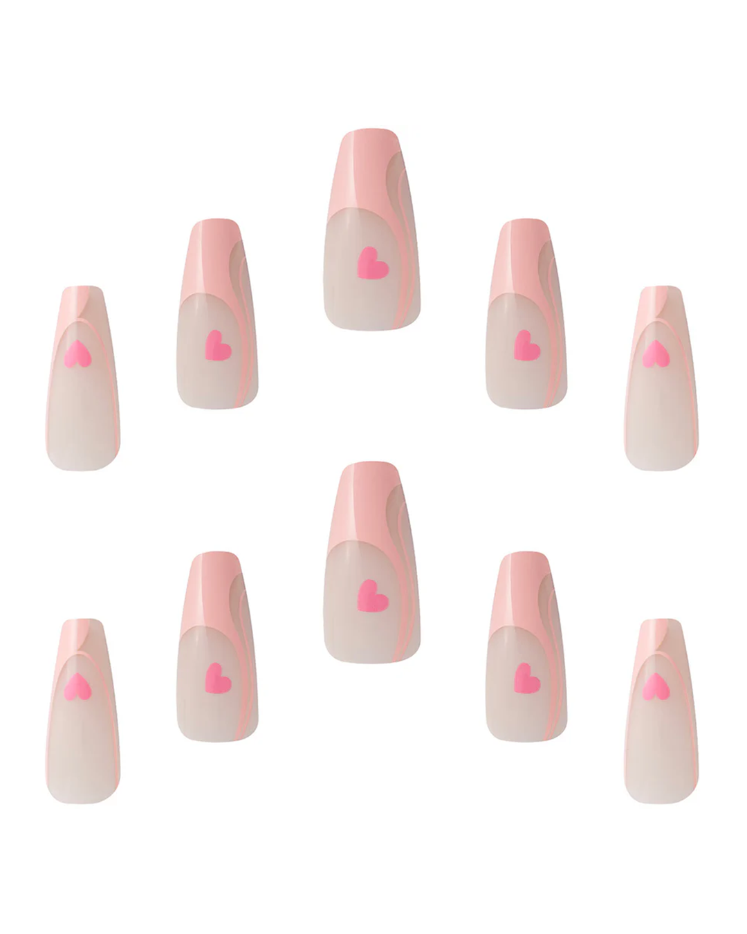 Fall in love with Elegant Touch Salon Edit False Nails in style I Heart Me. I Heart Me nails by Elegant Touch boast a lovely, light pink abstract French tip design with bright pink love heart nail art. These false nails are long in length and squarletto-shaped - they're super eye-catching and really look the part once applied.
