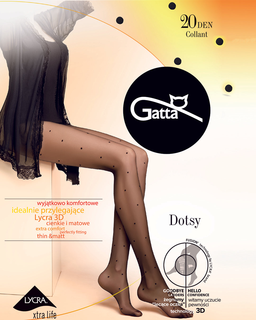 Stylish semi-matte 20 den tights ; made of innovative LYCRA 3D Fusion fibre with exceptional elasticity and improved resistance to thread pulling and laddering ; with all-over dot print ; reinforced toe portion.