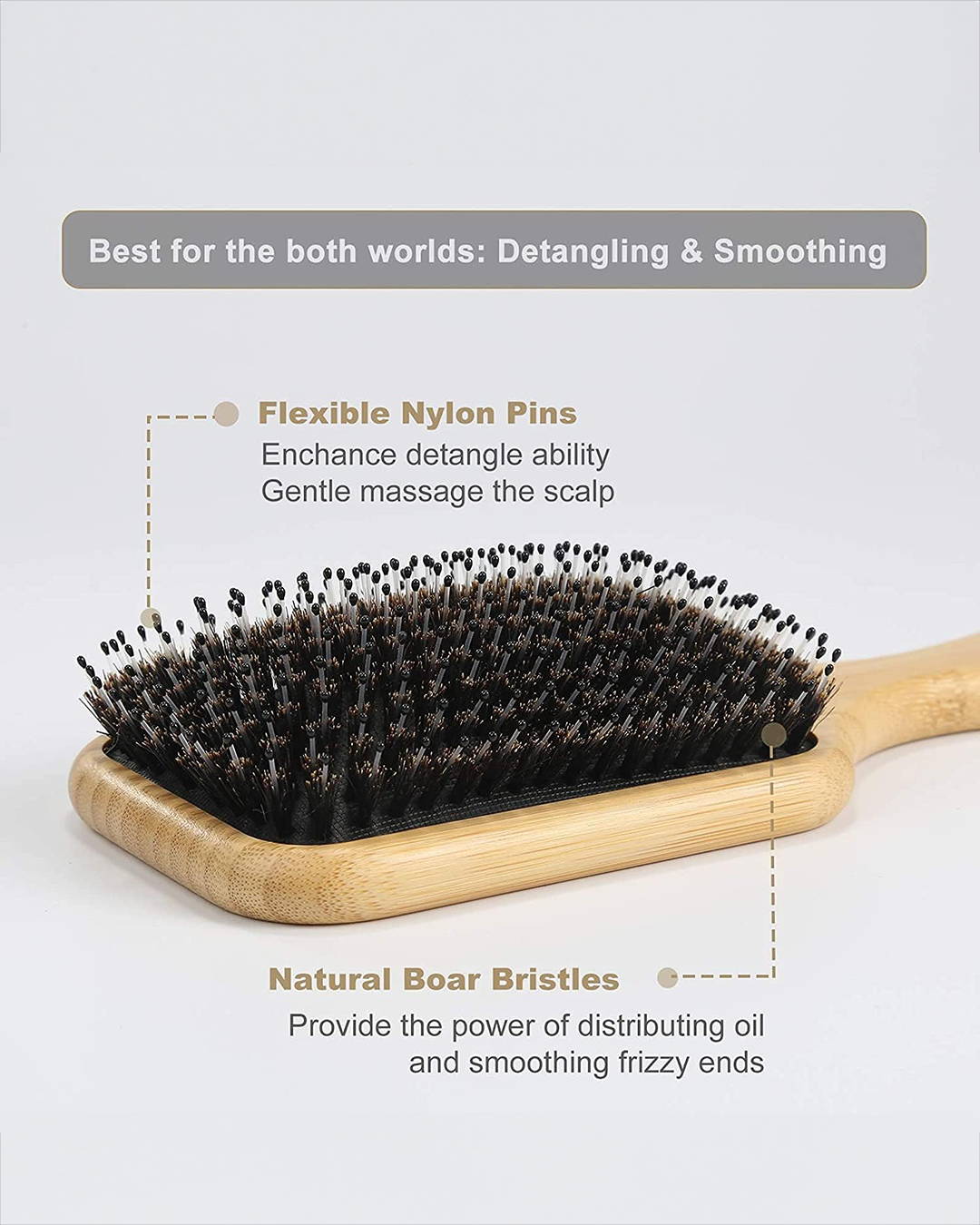 Detangle & Massage nylon pins in the brush enhance detangle ability, especially efficient on long thick curly hair, while a pure boar bristle cann't do. The smooth rounded tips give the scalp a gentle massage feel which can improve blood circulation and relax scalp muscles.
