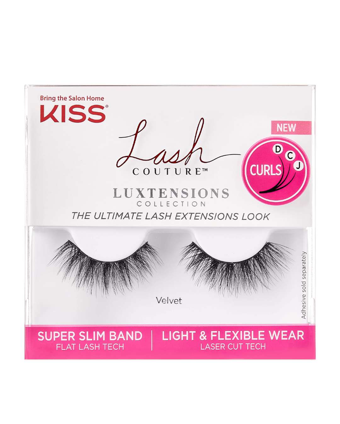 - KISS Lash Couture Luxtensions, Velvet is the ultimate false eyelash extensions look in a strip lash! Strip lash with super slim lash band & lightweight fit with a mix of D, C and J lash curls.