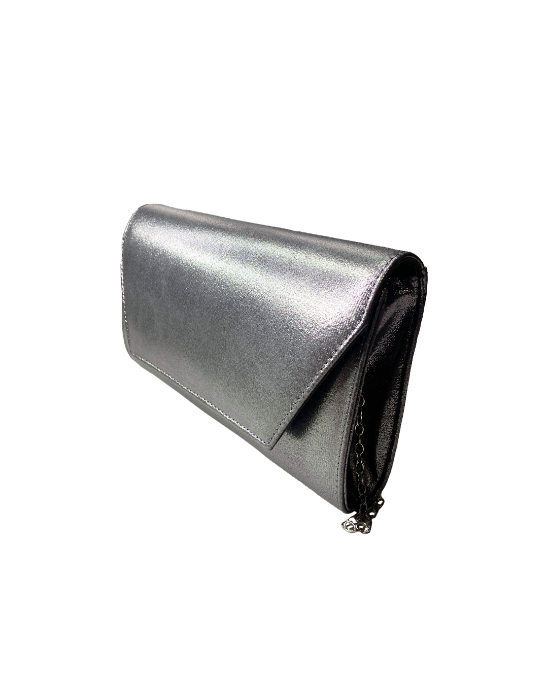 Silver Metallic leather clutch with a silver chain
