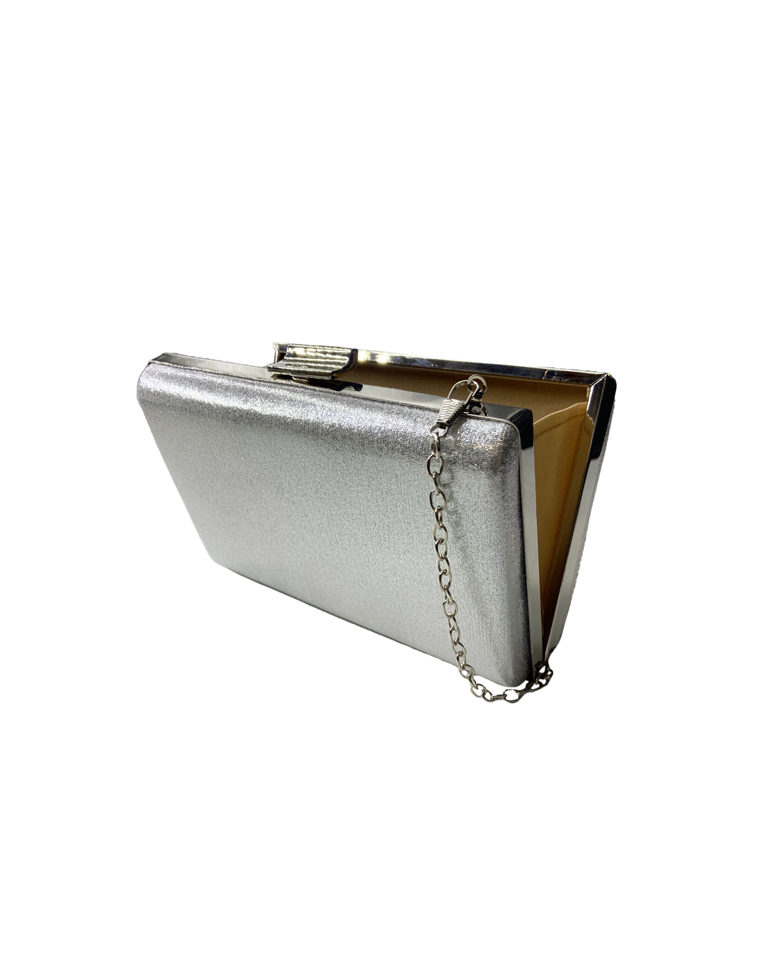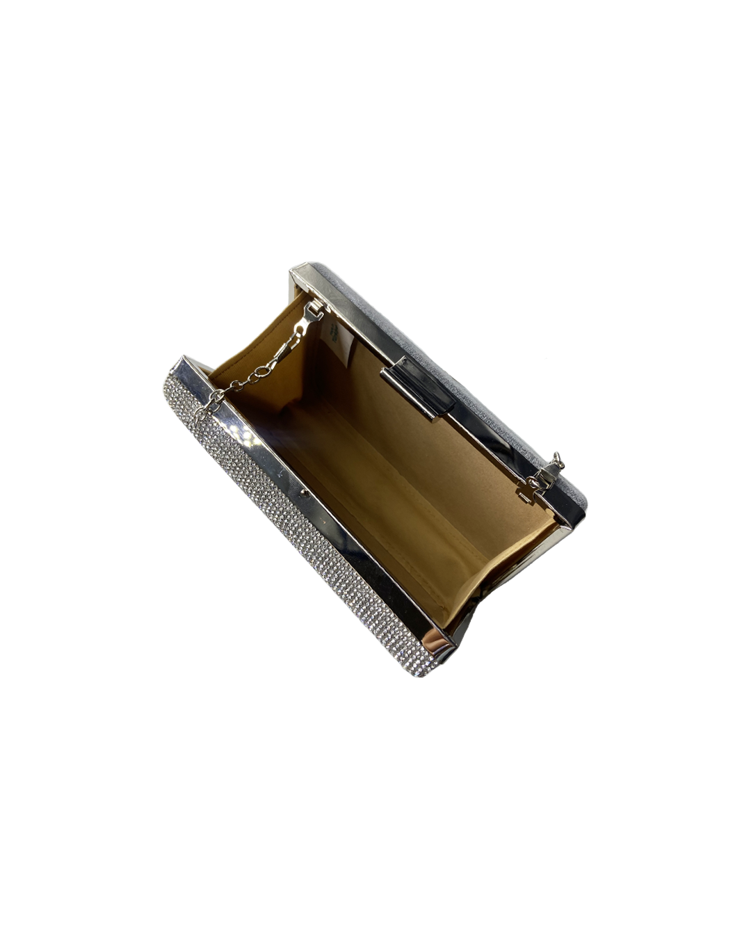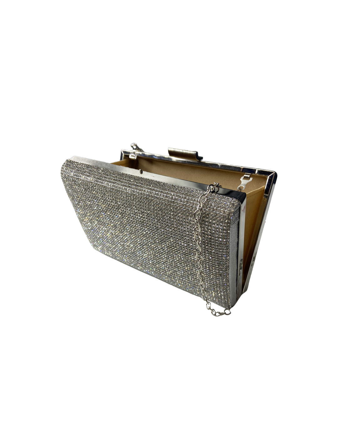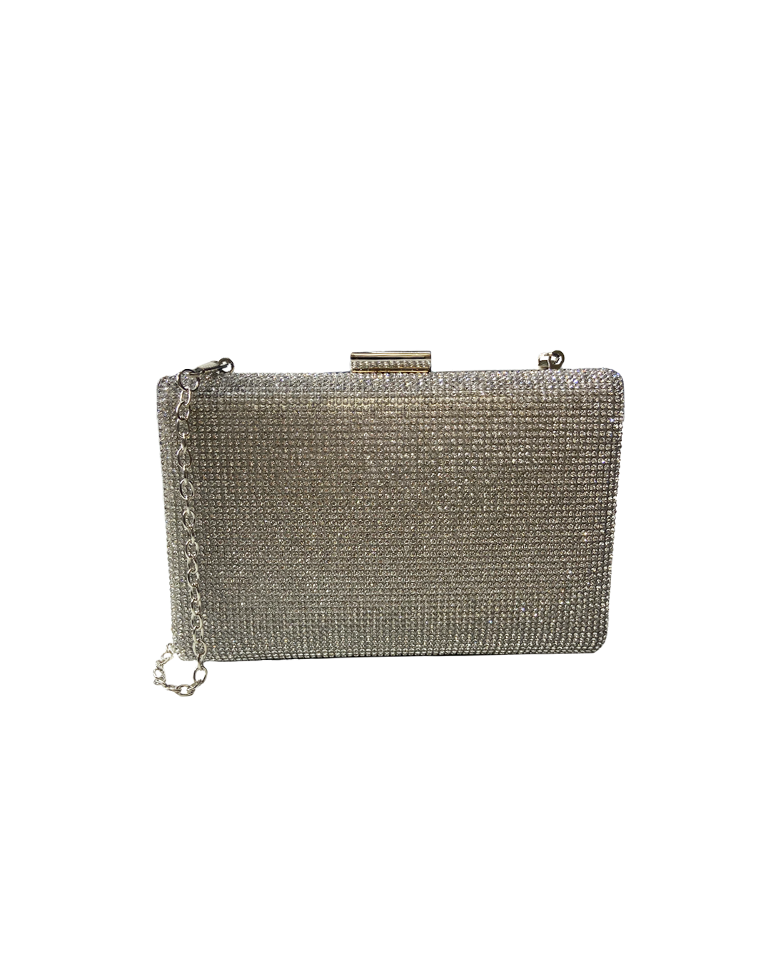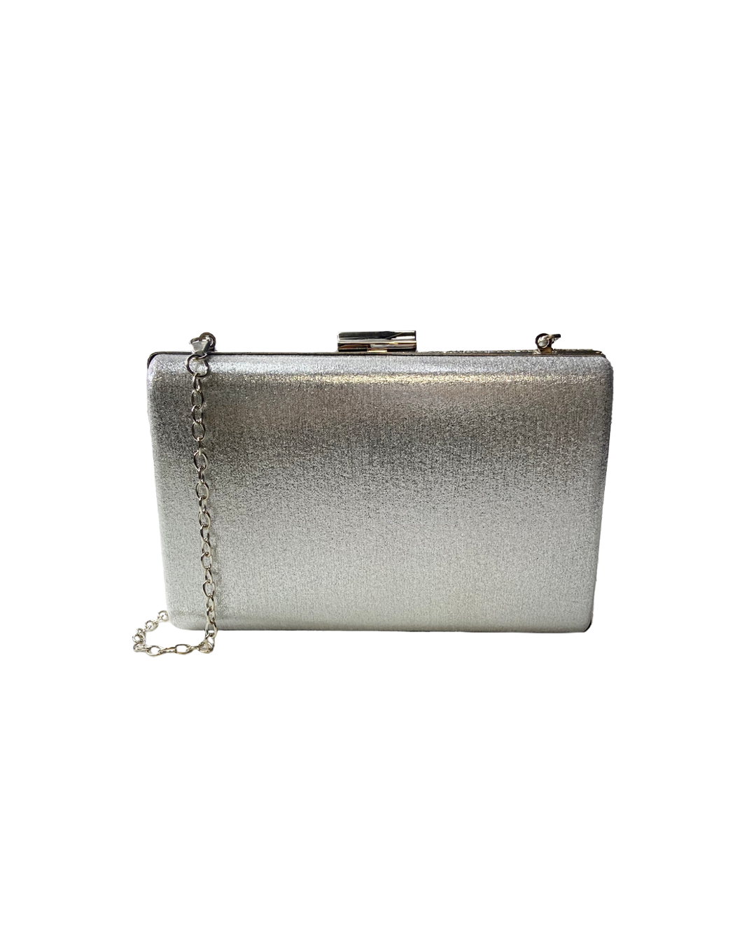 Double sided glittery and silver clutch with a silver chain